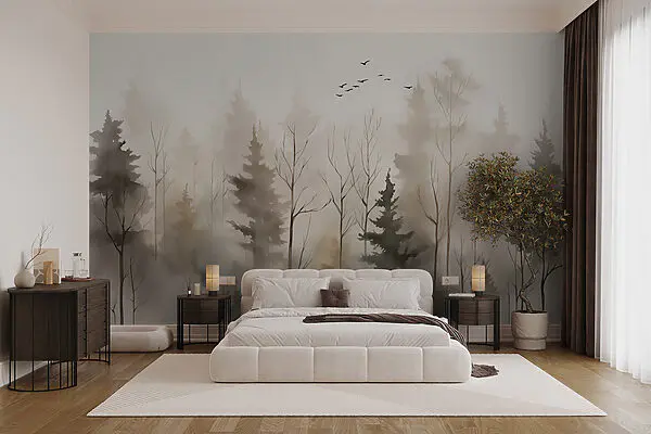 16.32 €9.80 €Carta da parati Acquerello di alberi e uccelli in volo su una foresta nebbiosa