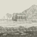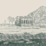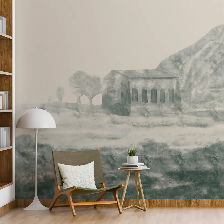 Carta da parati Dipinto raffigurante un edificio e una montagna