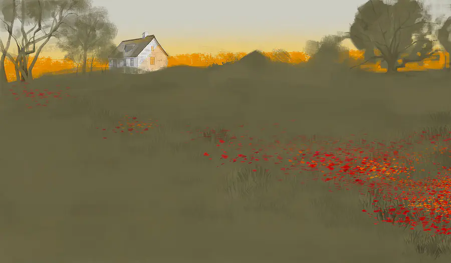 Carta da parati Campo di fiori rossi con una casa sullo sfondo