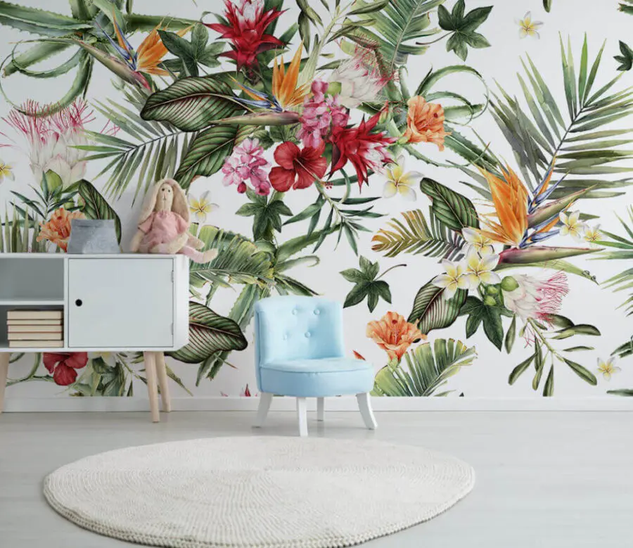 Immaginate di entrare in una stanza che sembra una fuga tropicale, senza la crema solare. Questo splendido murale, ricco di fiori vivaci e foglie rigogliose, trasforma qualsiasi spazio in un'oasi di allegria. Immaginate di gustare il vostro caffè mattutino circondati dalla natura, anche se si tratta solo della vista dalla vostra cucina. I colori vivaci e i dettagli intricati catturano l'essenza di un giardino assolato, risollevando immediatamente l'umore. Che si tratti di un'atmosfera da spiaggia o semplicemente di un tocco di colore, questo murale porta una rinfrescante spruzzata di felicità alle pareti. Non è solo una decorazione, è un piccolo pezzo di paradiso.