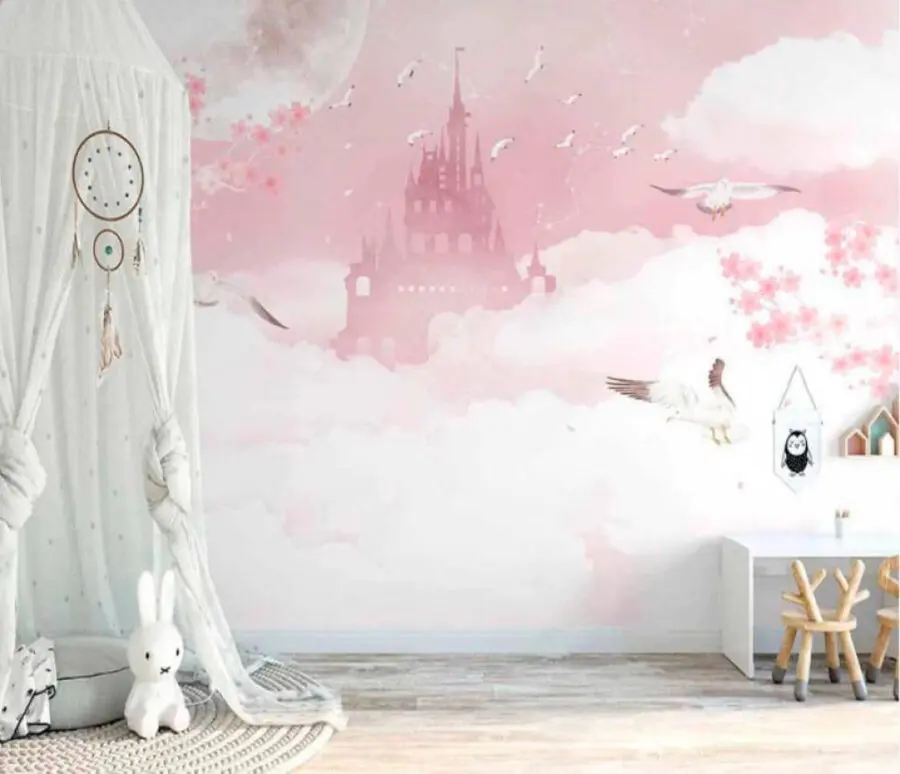 Immaginate di entrare in una stanza e di essere immediatamente trasportati in una scena da sogno, direttamente da una favola... Molto bello, vero? Questo murale "Castello con uccelli che volano nel cielo" è pura magia. C'è tutto: un maestoso castello che fa capolino tra soffici nuvole, una gigantesca luna piena che illumina i fiori di ciliegio rosa e uccelli che volano come se fossero i padroni del cielo. Perfetto per la camera di una bambina o per qualsiasi altro spazio che necessiti di un po' di estro, questo murale è un vero spettacolo. Immaginate il viso di un bambino che si illumina quando entra, meravigliandosi del suo personale regno del cielo. Sembra quasi di avere una finestra su un mondo fantastico dove tutto sembra possibile. I rosa tenui e i bianchi creano un'atmosfera rilassante, pacifica e al tempo stesso piena di meraviglia. Inoltre, la luce della luna non irradia sogni e dolci avventure notturne? Non è solo un murale: è un invito a lasciare libera l'immaginazione. Allora, siete pronti a trasformare una parete in una scena da libro di fiabe? Questo potrebbe essere il caso!