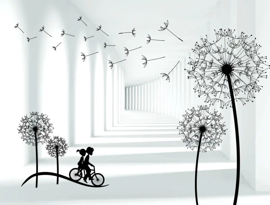Carta da parati Ragazza in bicicletta in una stanza con denti di leone