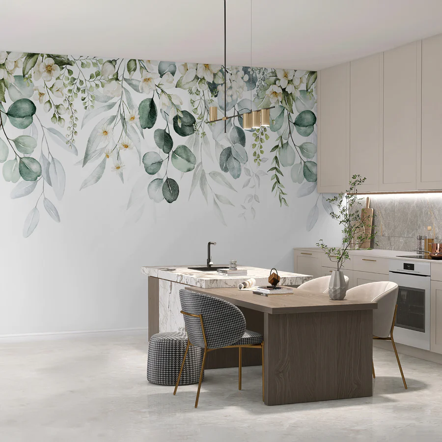 Immaginate di entrare in una stanza immediatamente rasserenante, con delicati fiori e foglie acquerellati che pendono sopra le vostre teste come un dolce baldacchino. Questo è ciò che otterrete con questo murale. Sembra di entrare in un sogno botanico: verdi e bianchi tenui che fanno sembrare tutto fresco e sereno. Immaginatelo nel vostro salotto o magari nella vostra camera da letto; porta un tocco di natura proprio all'interno, senza bisogno di avere il pollice verde. Basta osservare i morbidi petali e le foglie che scorrono e si può quasi sentire un leggero profumo floreale che aleggia nell'aria. Perfetto per sognare ad occhi aperti sorseggiando il caffè del mattino o per rilassarsi dopo una lunga giornata. Se amate l'arredamento unico o volete semplicemente dare un'atmosfera di pace al vostro spazio, questo murale aggiunge il mix perfetto di arte e tranquillità. Perché non creare la vostra piccola fetta di paradiso?