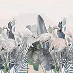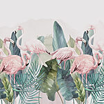 Carta da parati Un gruppo di fenicotteri rosa e foglie