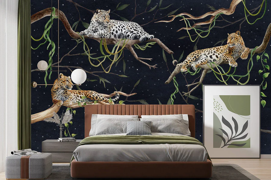 Immaginate di entrare in una stanza in cui un trio di leopardi si adagia pigramente sui rami, avvolti da una vegetazione lussureggiante. Questo splendido murale cattura l'eleganza rilassata di questi grandi felini, portando una fetta di natura in casa vostra. Le loro macchie giocose e le loro pose serene invitano a fermarsi e a respirare. Immaginate di accoccolarvi con un buon libro sotto il loro sguardo vigile o di ospitare amici che non potranno fare a meno di ammirare il vostro gusto unico. È come avere un pezzo di natura selvaggia, senza le zanzare e il tempo imprevedibile. Perfetto per quella parete che ha bisogno di un po' di magia!