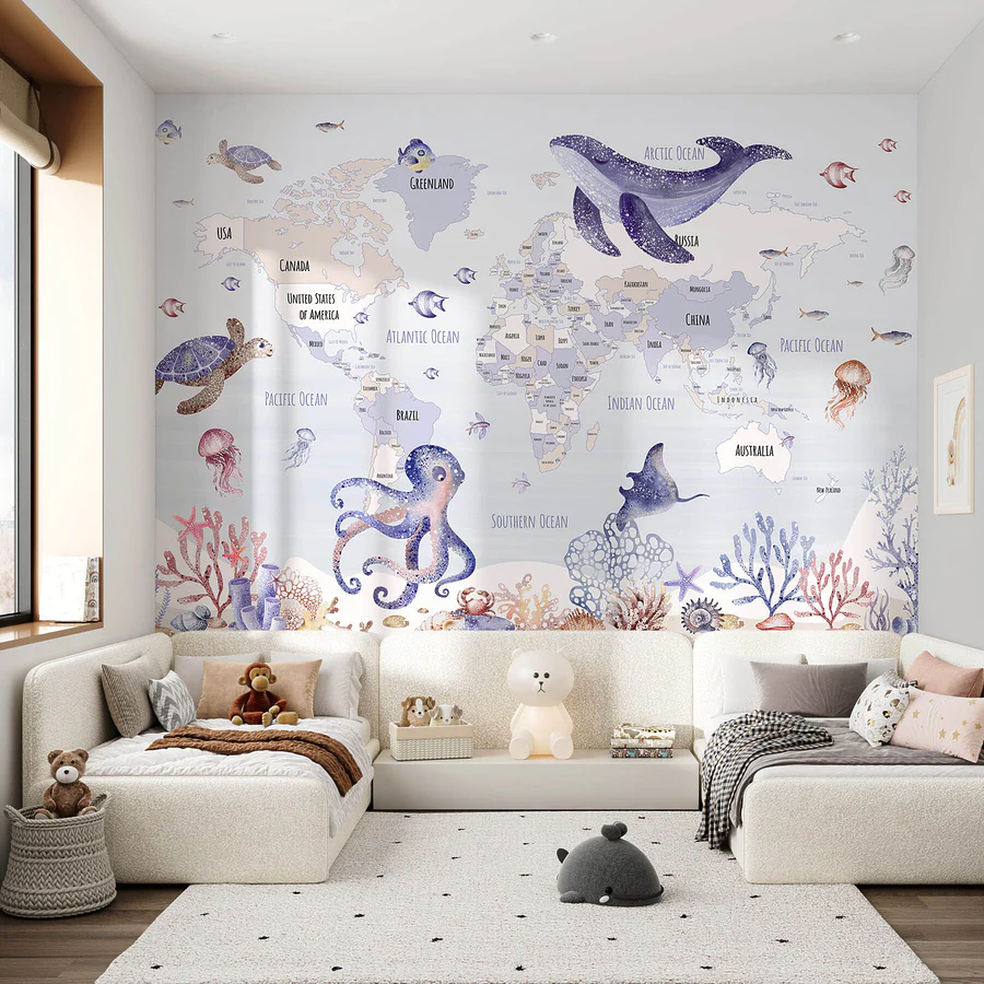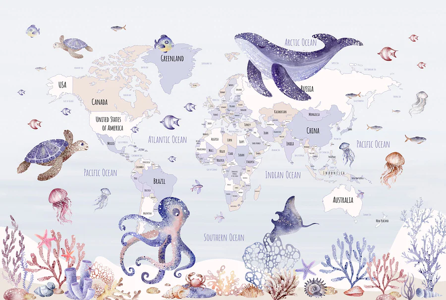 Carta da parati Mappa del mondo con animali marini