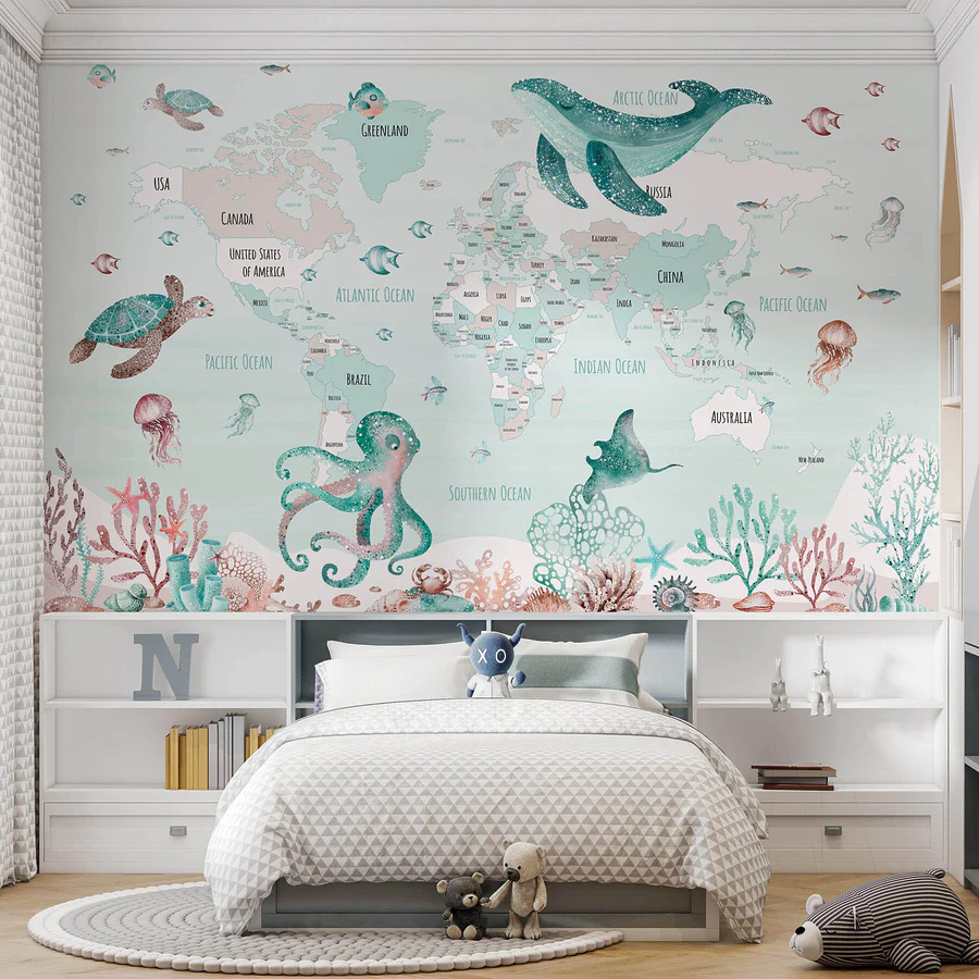 16.32 €9.80 €Carta da parati Mappa del mondo con animali marini