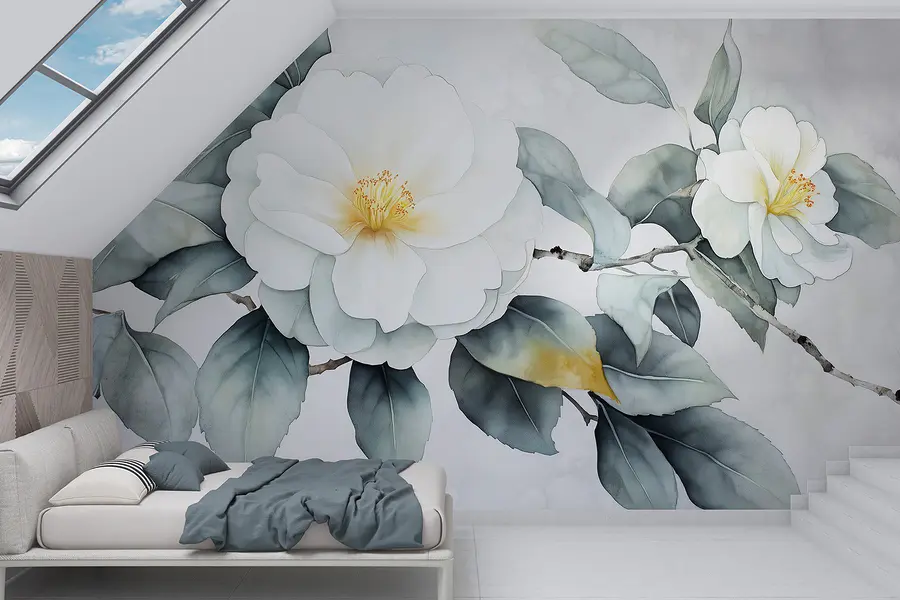 Carta da parati Fiore bianco con foglie verdi