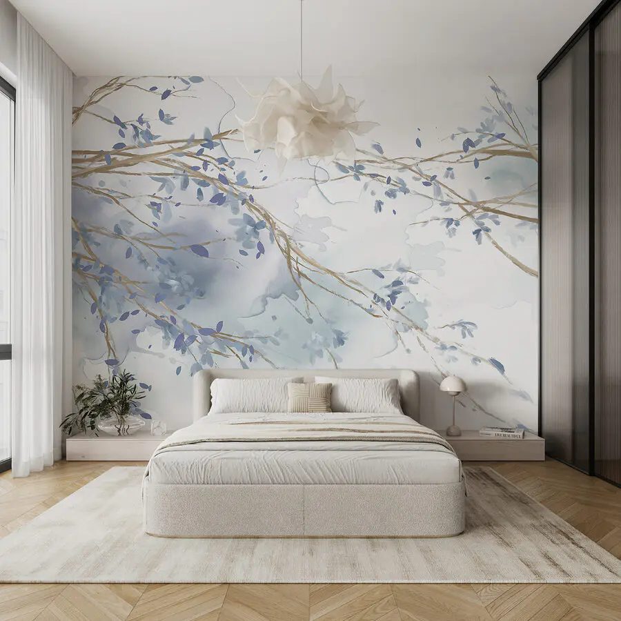 Carta da parati Acquerello di un ramo d’albero con foglie blu